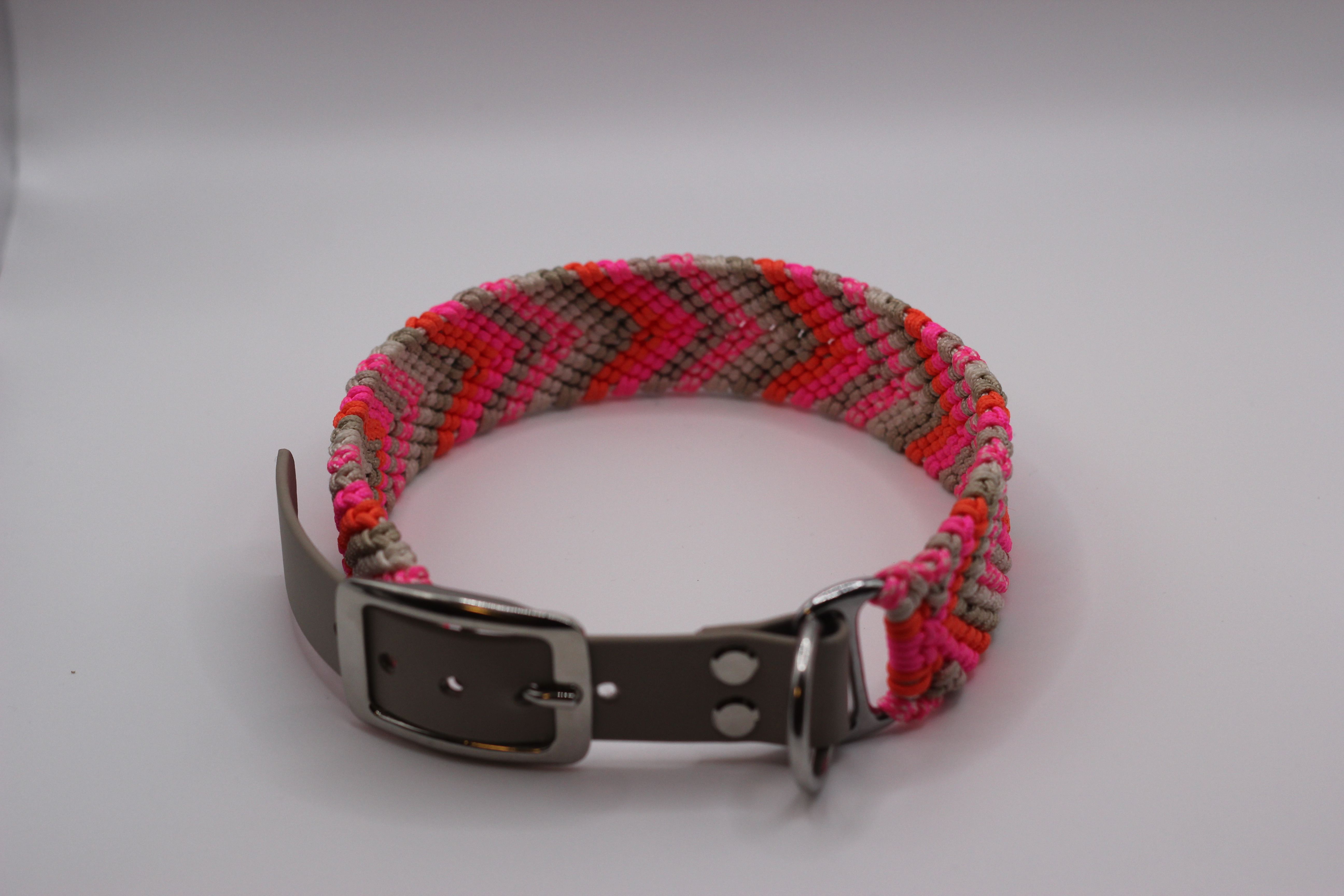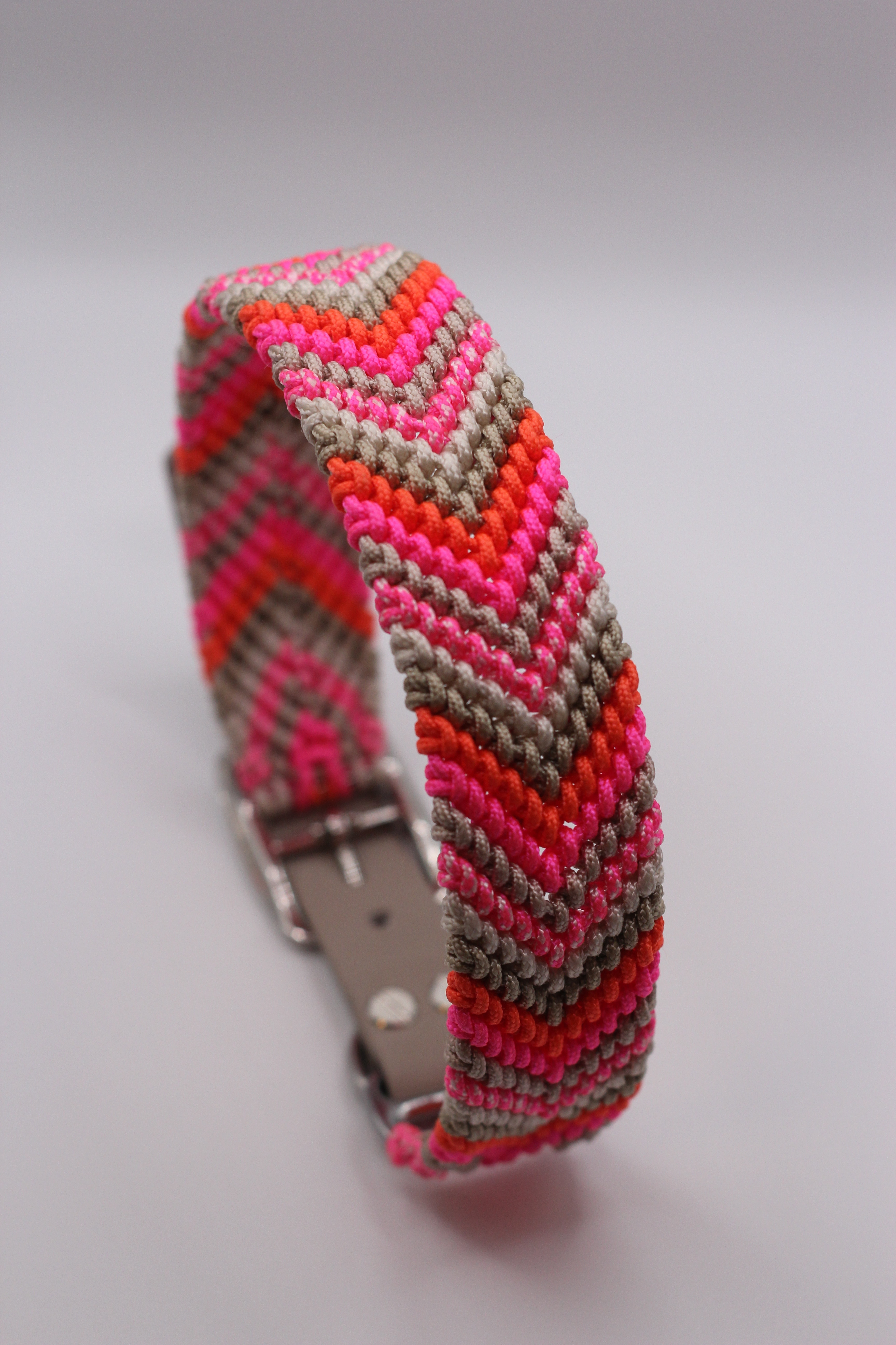 Strahlend wie ein Sommerabend: Das Sunset Glow Halsband kombiniert kräftiges Neonpink mit warmem Orange und sanftem Taupe im markanten Fischgrätenmuster. Diese besondere Farbkombination erinnert an leuchtende Sonnenuntergänge und macht jedes Halsband zu einem echten Hingucker.