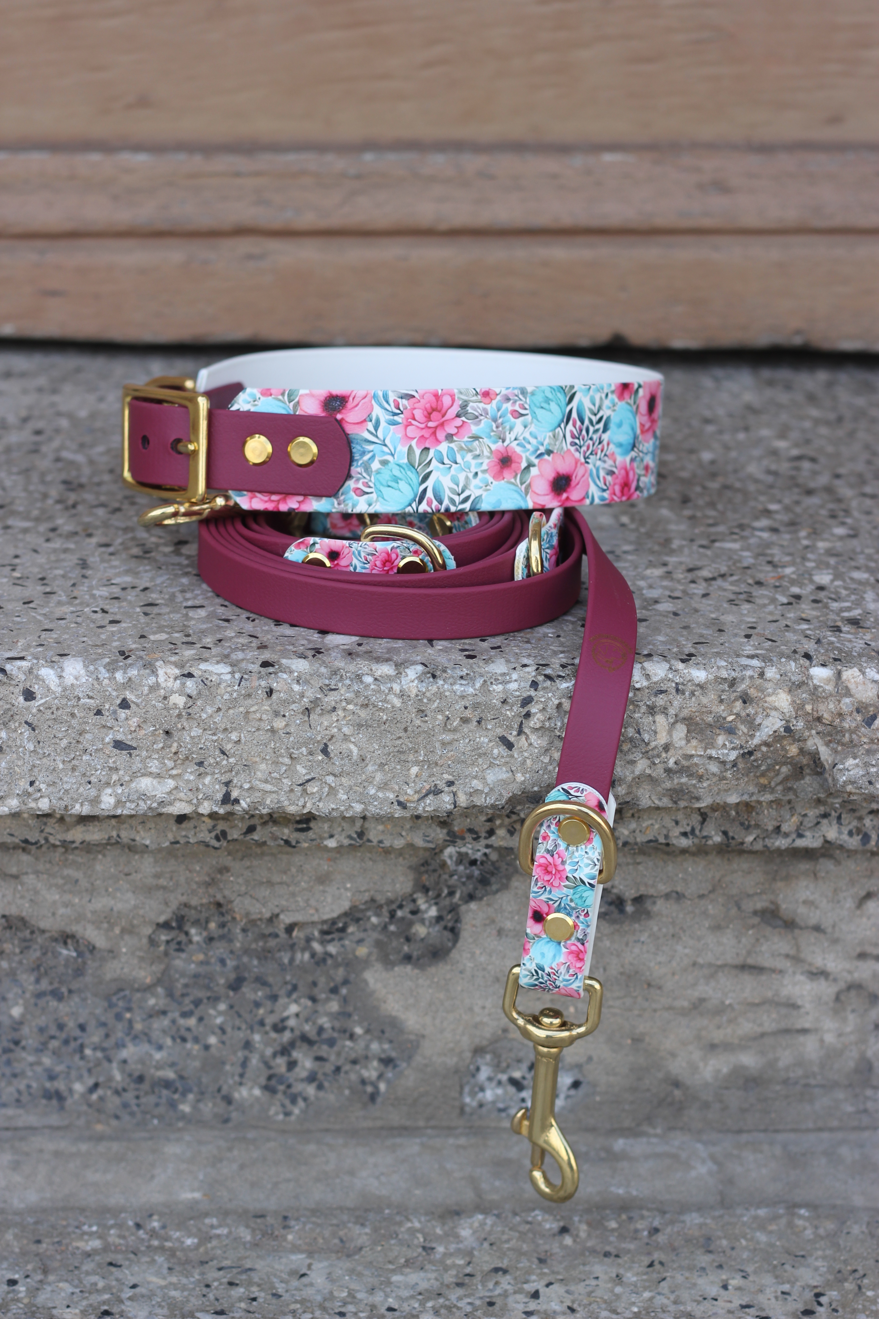 Verspielt, elegant und voller Leichtigkeit – Rosé Blossom bringt florale Frische in euren Alltag. Das harmonische Zusammenspiel aus zartem Blumenmuster in Türkis- und Rosétönen und der edlen, bordeauxfarbenen Biothane macht dieses Set zu einem echten Hingucker.