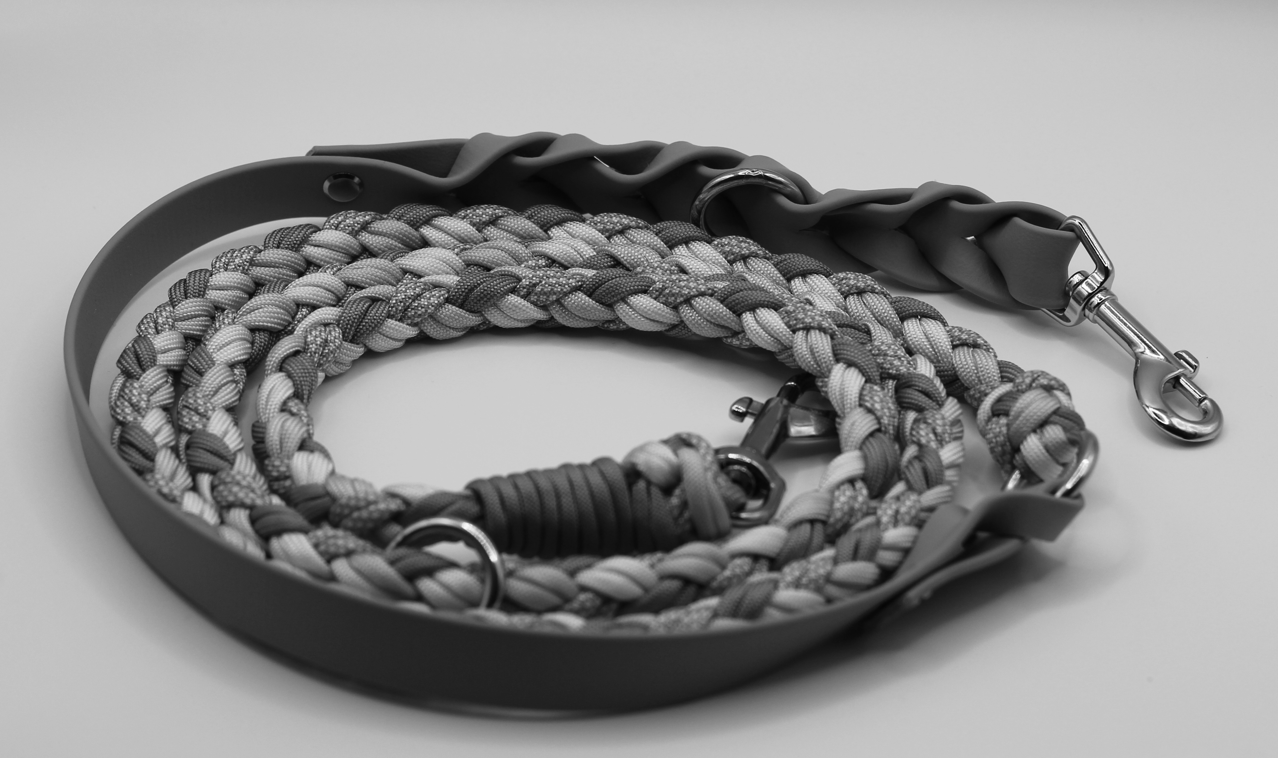 Diese handgefertigte Leine vereint Funktionalität und Stil. Das aufwendig geflochtene Paracord sorgt für hohe Stabilität, eine angenehme Haptik und ein einzigartiges Design. Ergänzt wird es durch Biothane – ein wasserfestes, pflegeleichtes Material, das sich auch bei Regen und Matsch bewährt.