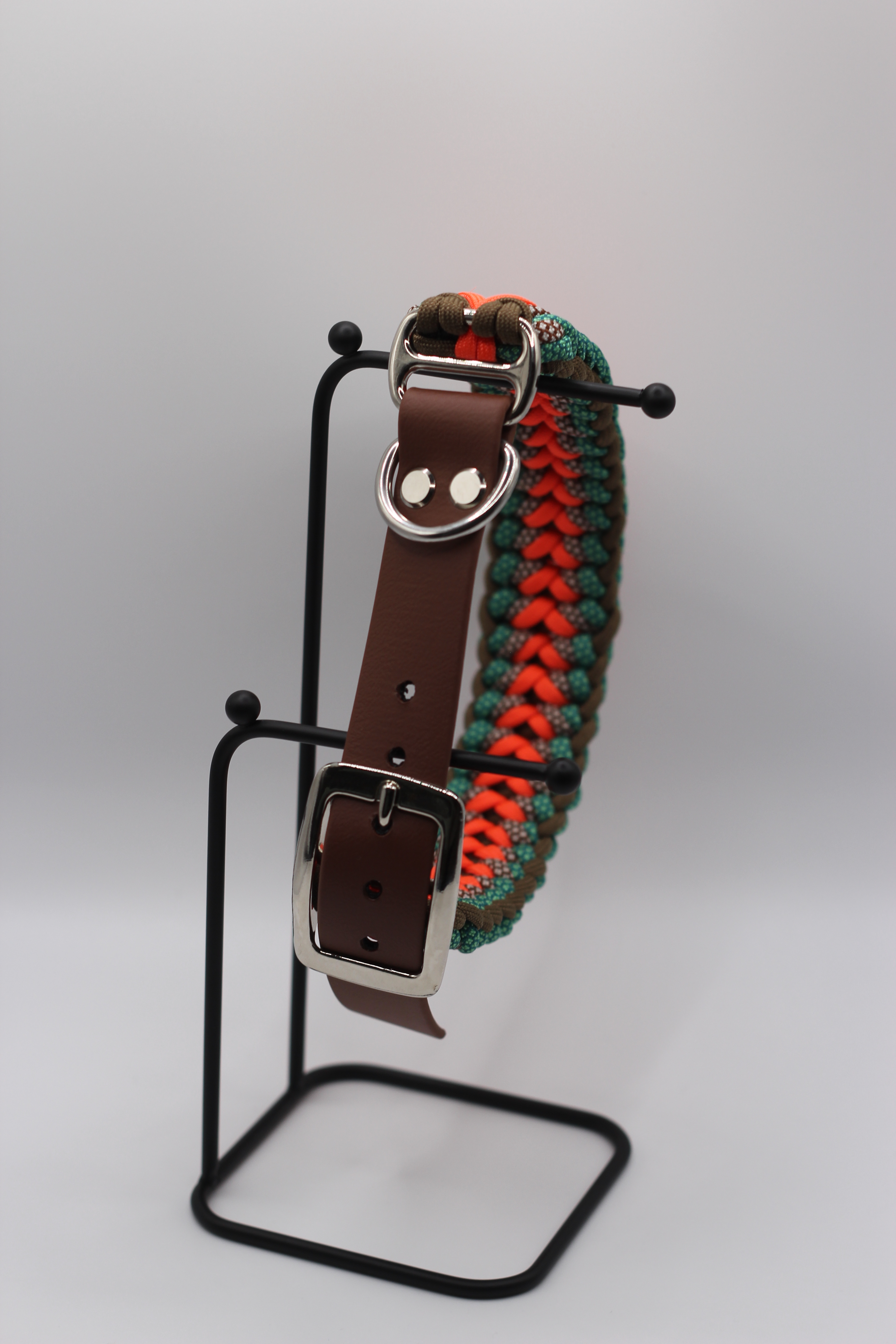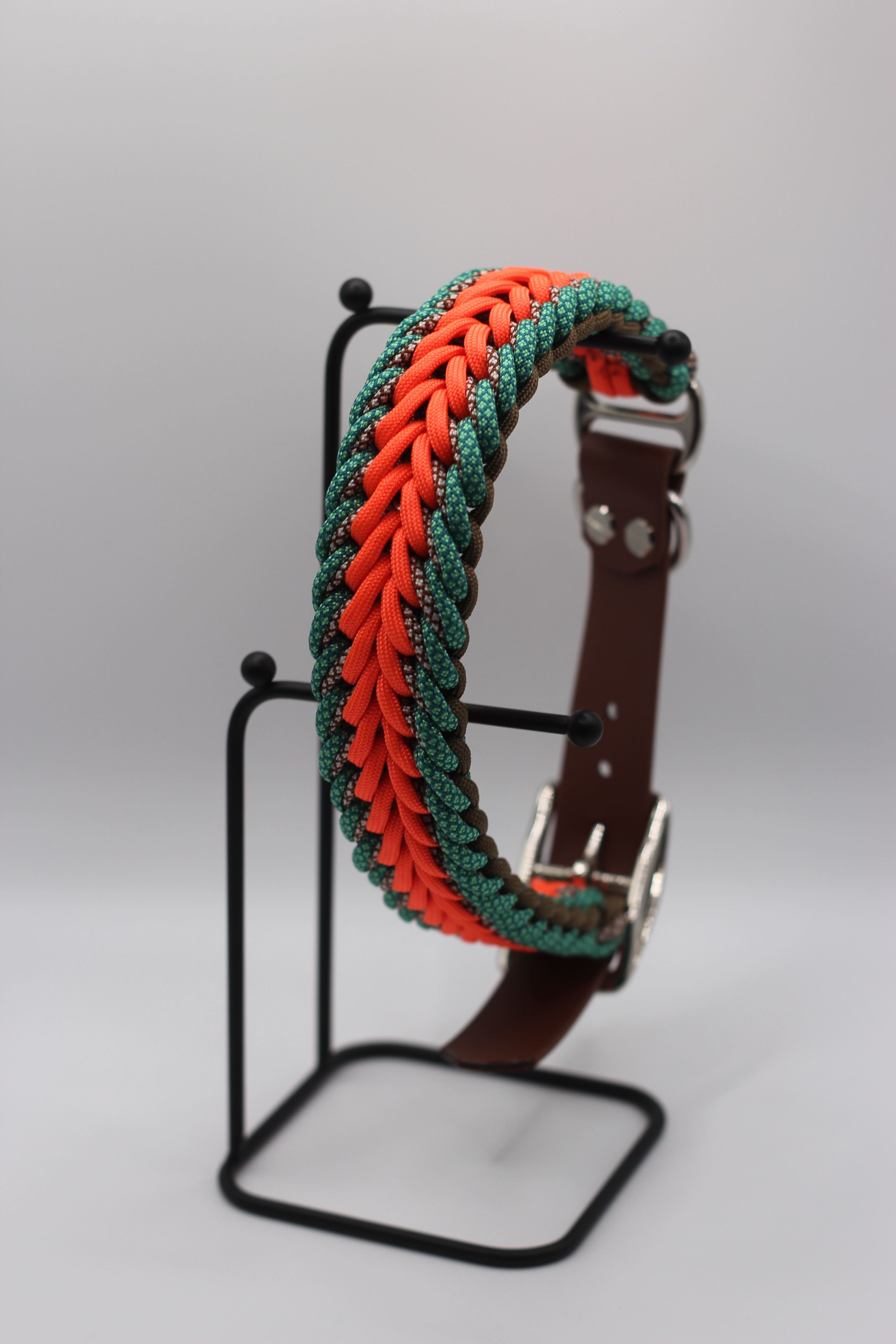 Natur trifft Leuchtkraft: Forest Flame vereint sattes Grün mit strahlendem Orange und warmen Brauntönen. Die handgeflochtene Paracord-Struktur liegt angenehm am Hals und verleiht dem Halsband Stabilität sowie einen unverwechselbaren Look. Abgeschlossen wird es mit einem Biothane-Adapter als Verschluss, der das Halsband verstellbar, robust und pflegeleicht macht. Biothane ist wasserfest, geruchsneutral, formstabil und lässt sich mit einem Wisch reinigen – ideal für Abenteuer bei jedem Wetter.