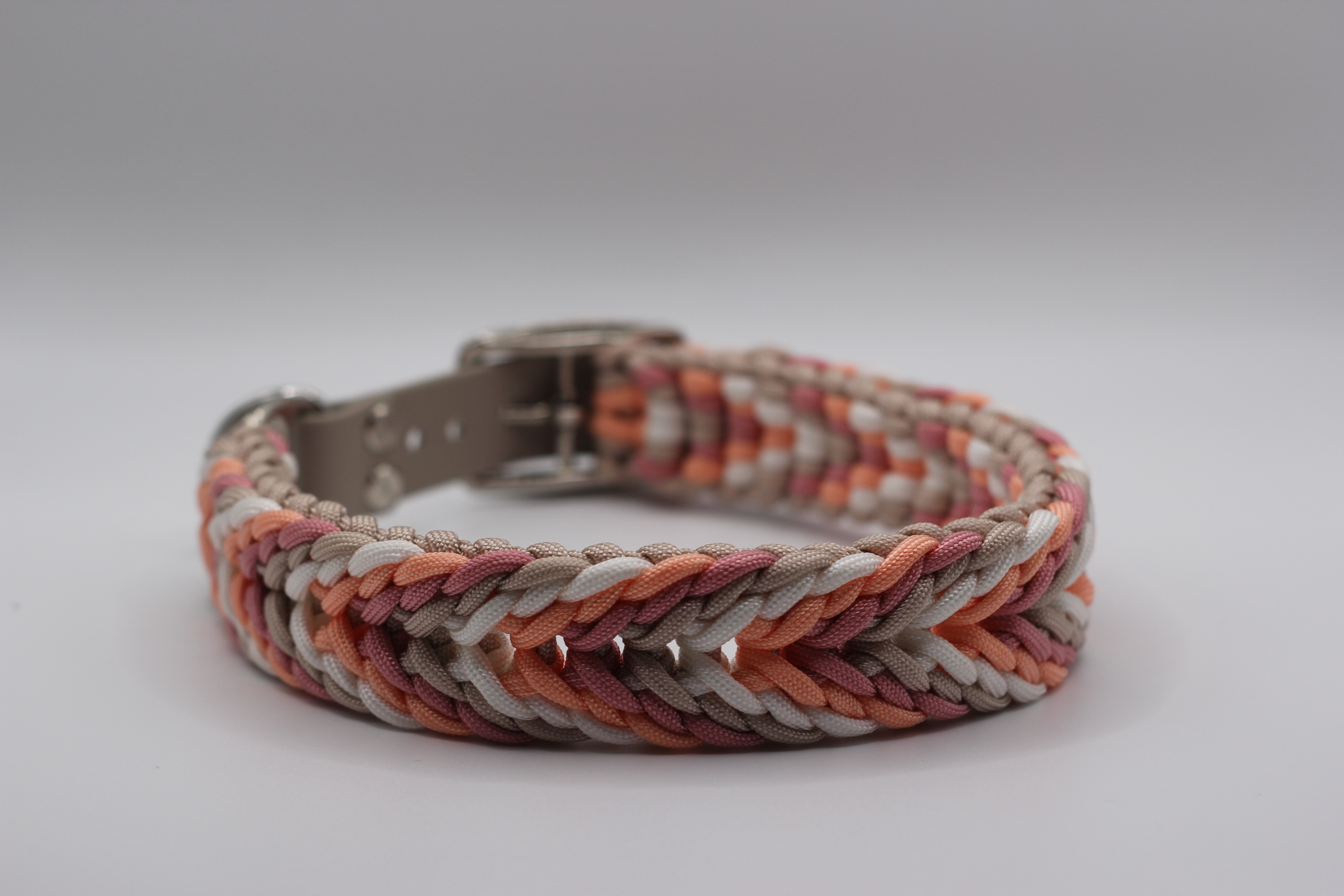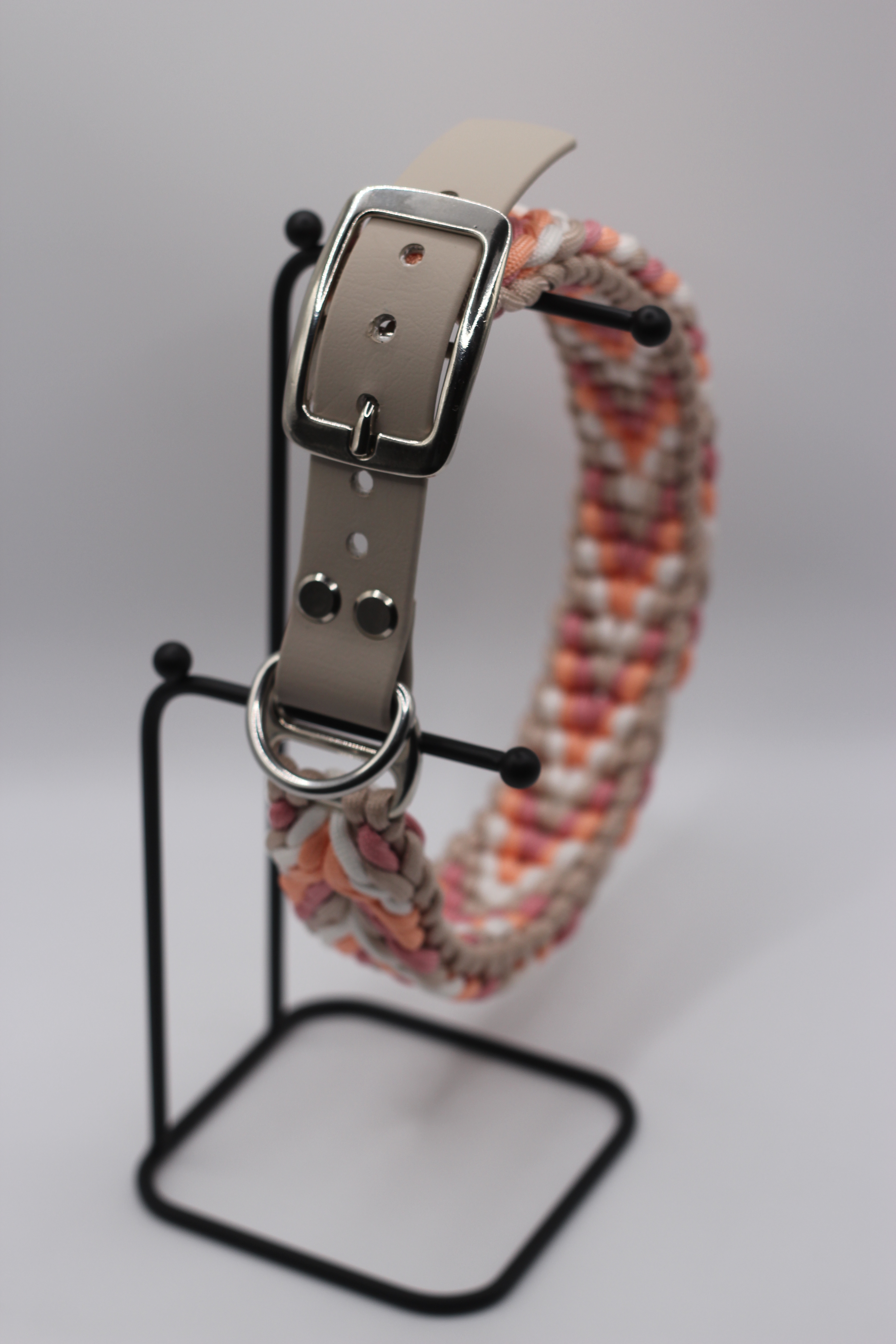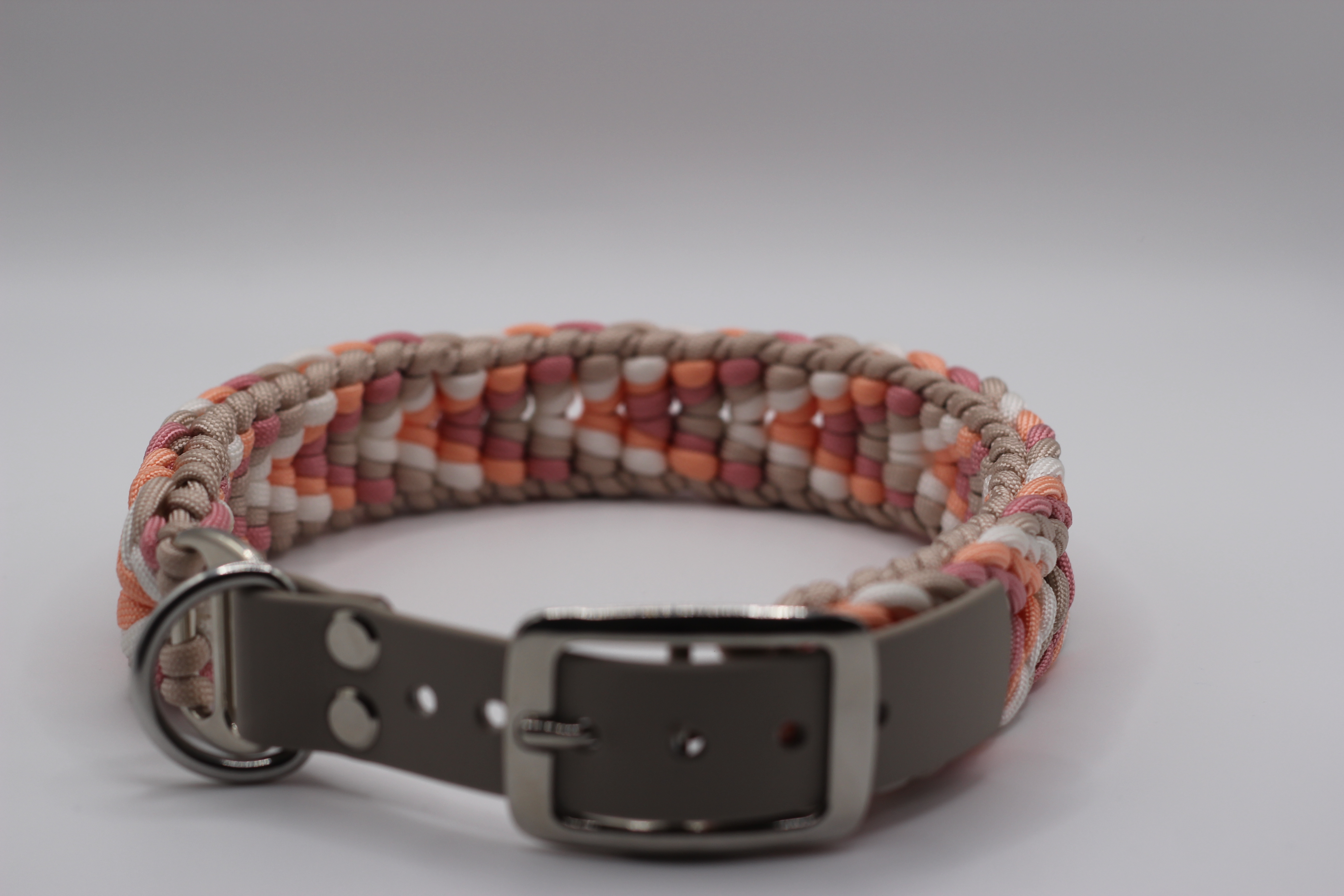 Das Halsband Hazel (von thegoldenone.hazel) überzeugt mit seiner eleganten Flechtoptik in warmen Natur- und Rosétönen. Die harmonische Kombination aus Beige, Apricot und zartem Rosa verleiht dem Halsband eine sanfte, aber dennoch edle Ausstrahlung – perfekt für stilbewusste Hundehalter:innen, die Wert auf Individualität legen.