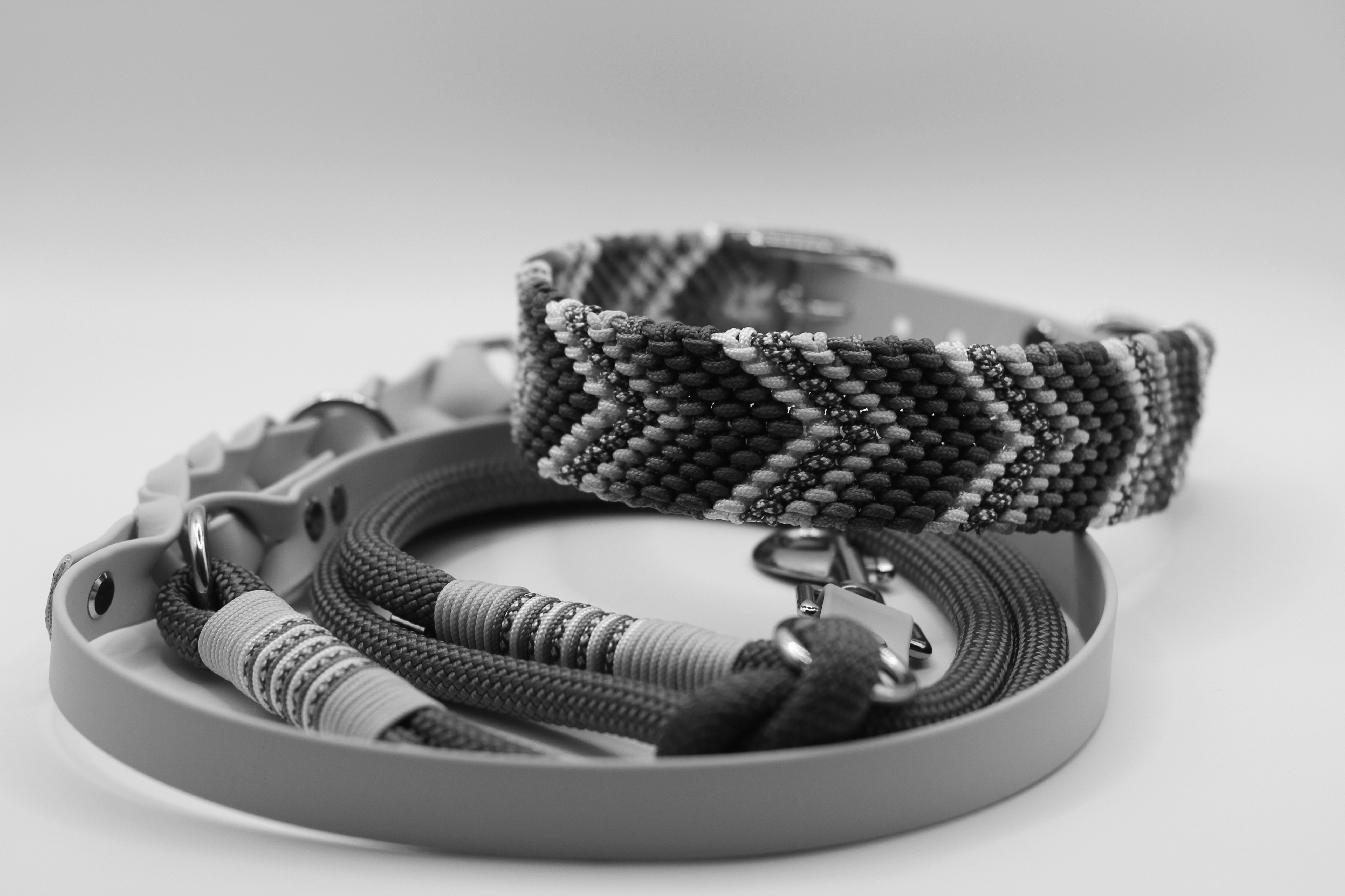 Tau & Biothane. Das Halsband mit seinem detailreichen Chevron-Flechtmuster ist ein echter Blickfang, während die Leine durch die Kombination aus flexiblem Tau und stabilem Biothane überzeugt – robust, pflegeleicht und gleichzeitig angenehm in der Hand.
