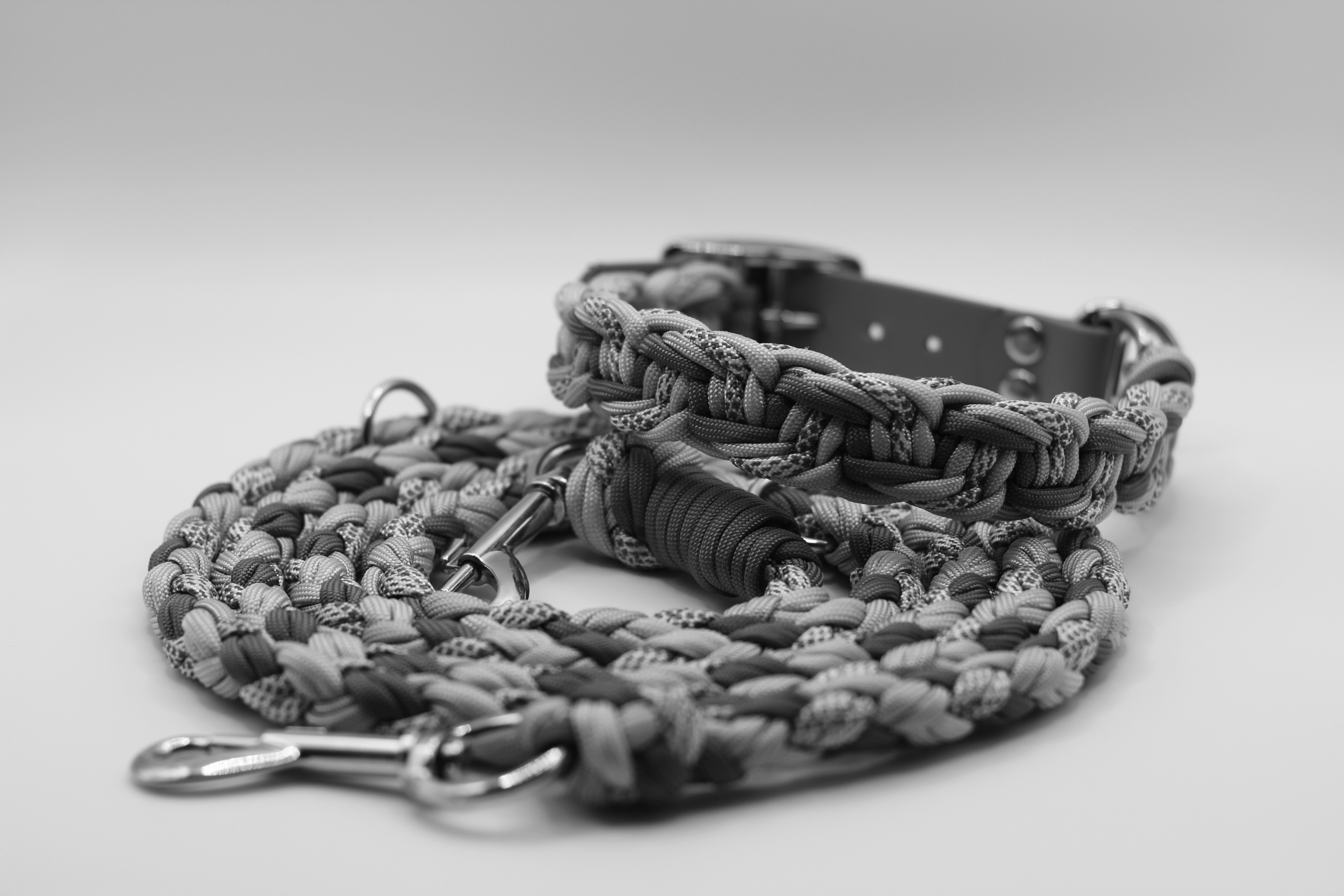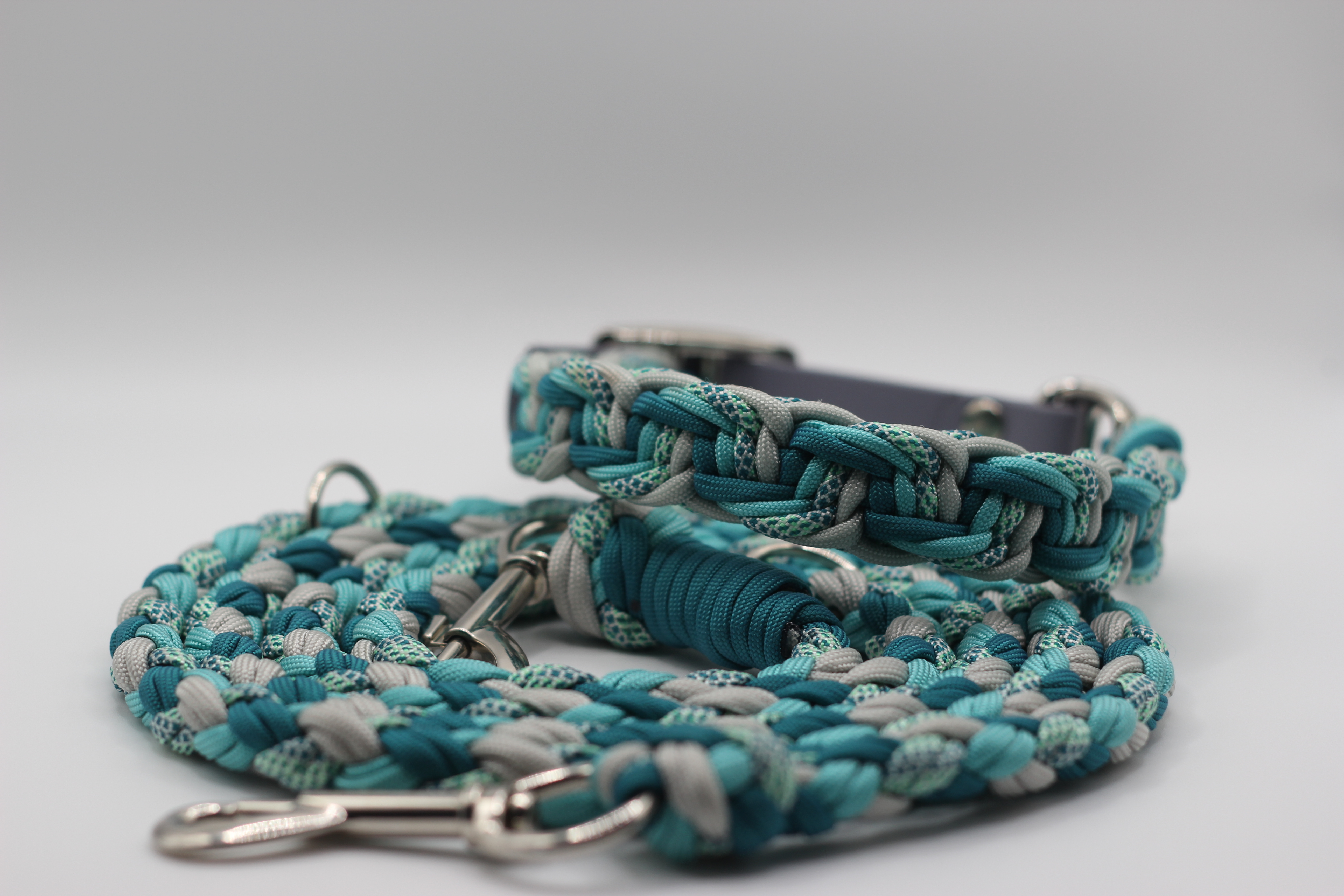Das Set „Wave“ vereint edles Design mit höchster Funktionalität. Das Halsband und die Leine sind aus hochwertigem Paracord gefertigt, das durch seine Strapazierfähigkeit und angenehme Haptik überzeugt. Die Flechtung sorgt nicht nur für einen einzigartigen Look, sondern macht das Set auch besonders robust.
