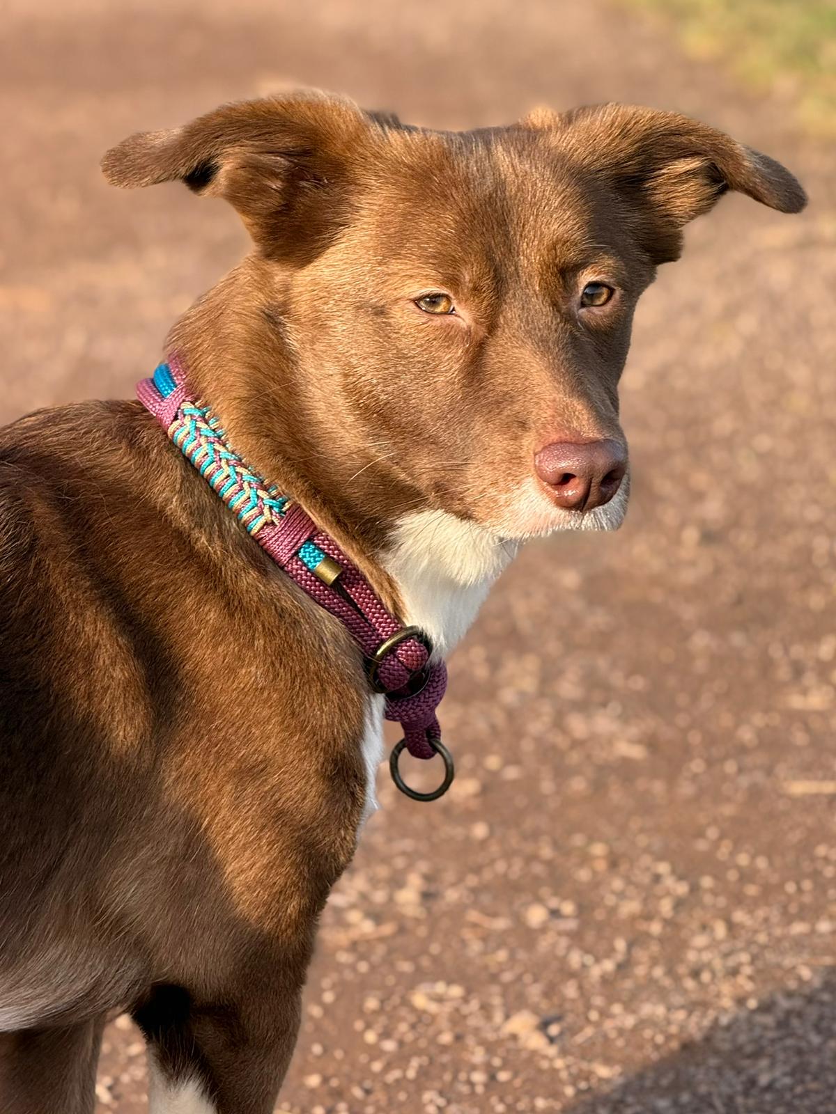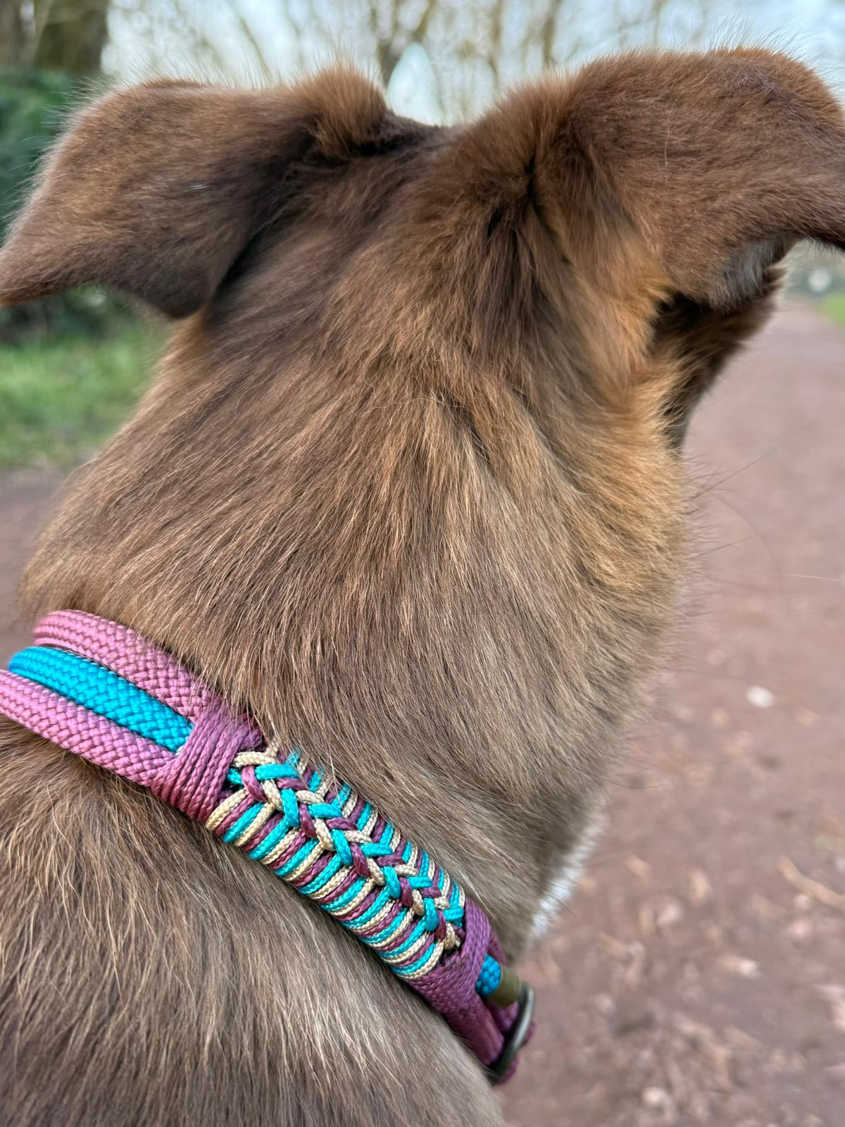 Akzentuiert wird das Design durch feine Umwicklungen in Petrol und Sand, die dem Halsband Tiefe und Lebendigkeit geben, ohne aufdringlich zu wirken. Die Farbkombination erinnert an Natur, Herbstlicht und klare Luft – harmonisch, zeitlos und dennoch besonders.
