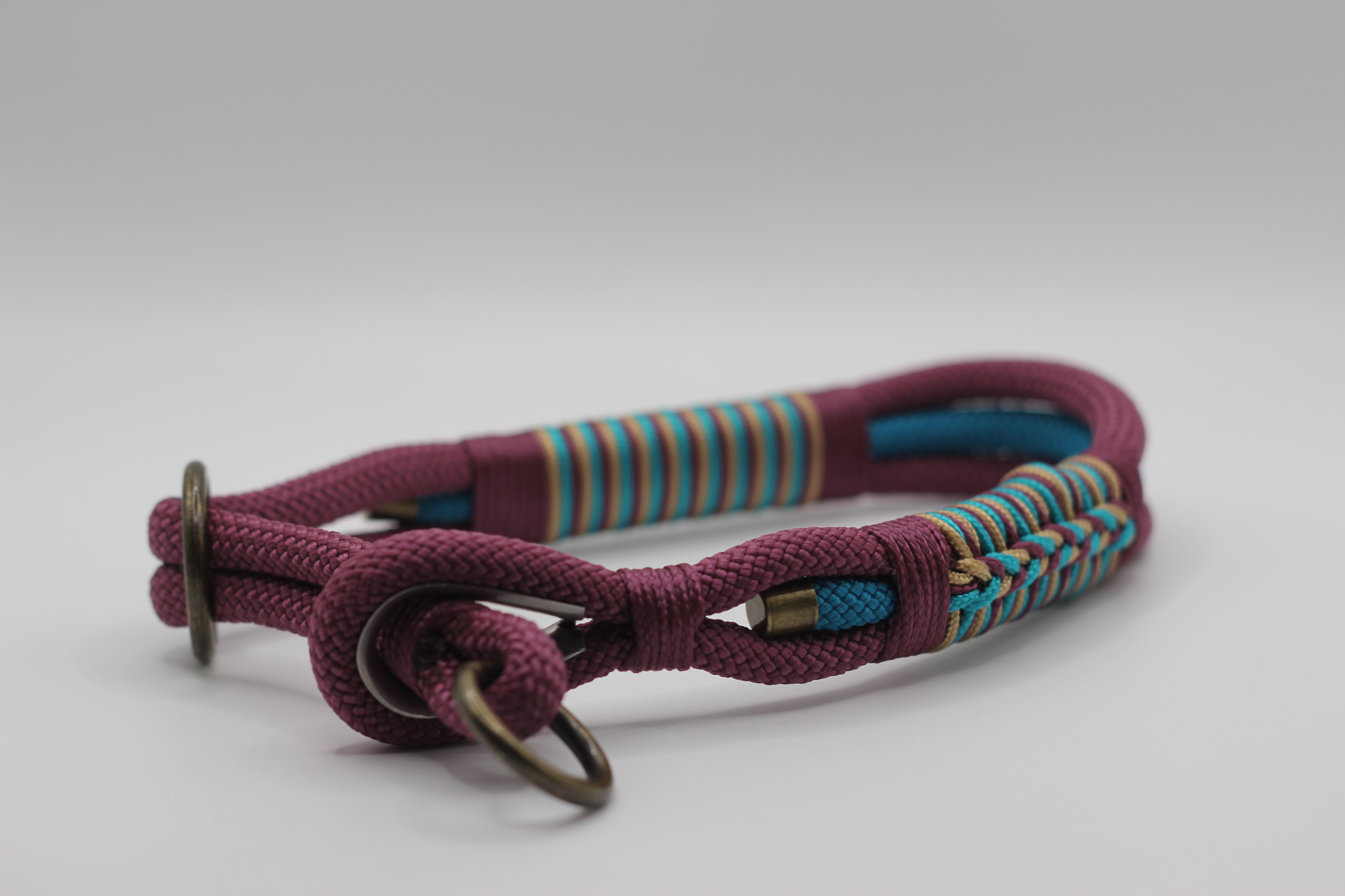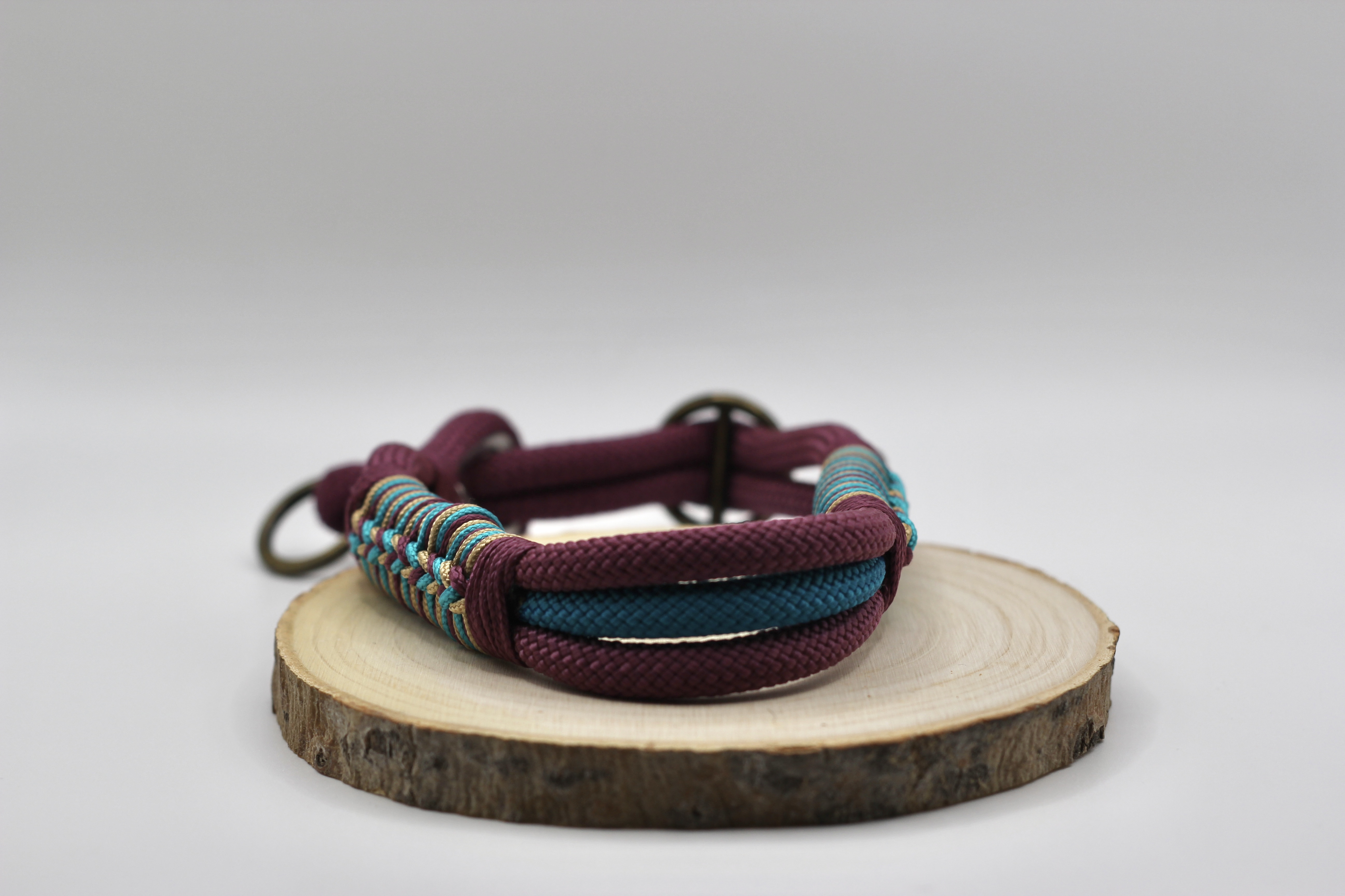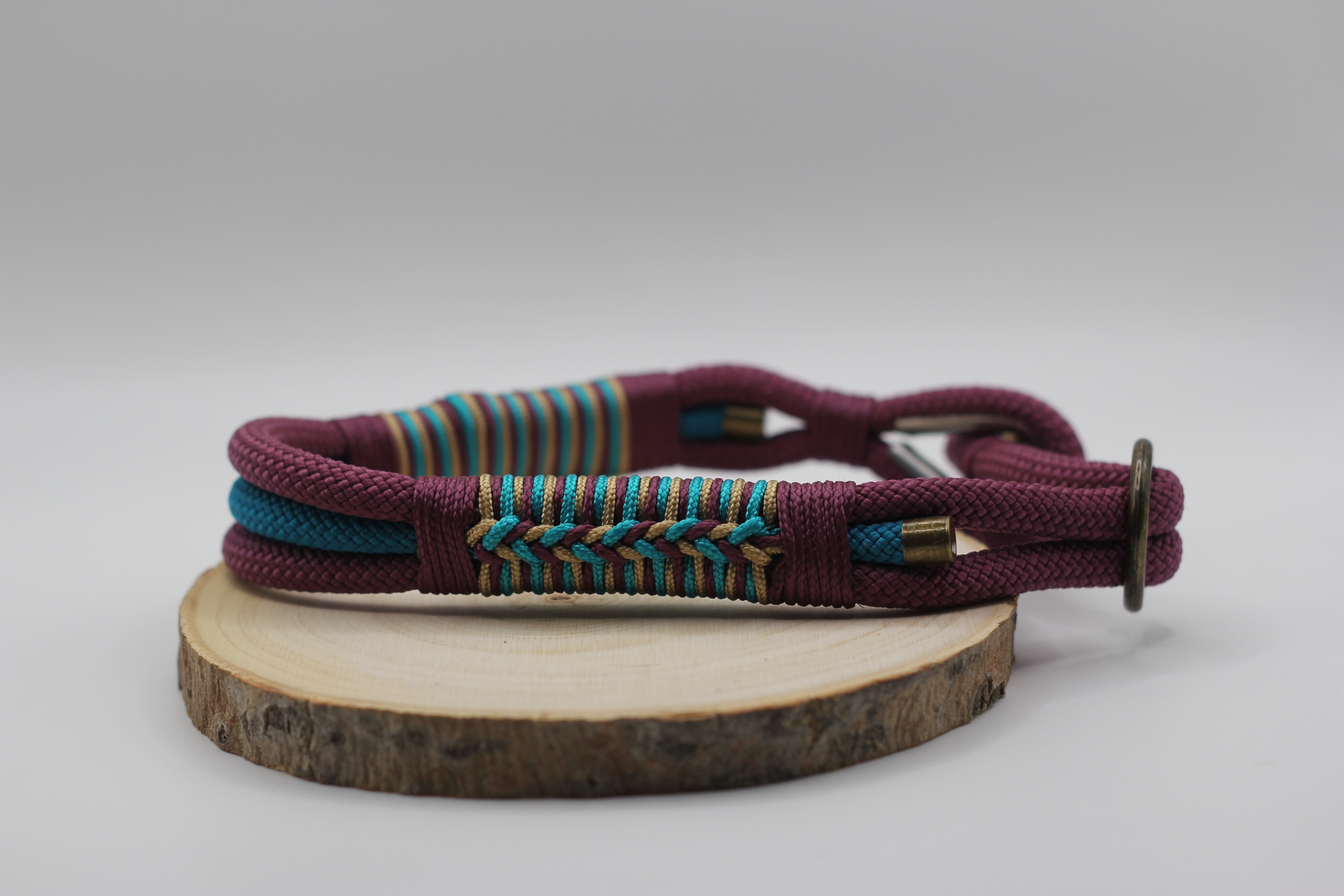 Wilma Pure vereint klare Formen mit einer ausdrucksstarken, aber ruhigen Farbkomposition. Das 3-fach gelegte Tau in warmem Beerenton bildet die Basis des Halsbands und verleiht ihm eine edle, natürliche Ausstrahlung.